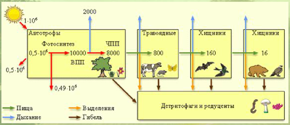 Органическое вещество, производимое автотрофами, называется первичной продукцией. Скорость накопления энергии первичными продуцентами называется валовой первичной продуктивностью, а скорость накопления органических веществ – чистой первичной продуктивностью. ВПП примерно на 20 % выше, чем ЧПП, так как часть энергии растения тратят на дыхание. Всего растения усваивают около процента солнечной энергии, поглощённой ими.