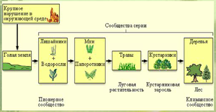 Смена одних сообществ другими называется экологической сукцессией. В первом случае наблюдается так называемая первичная сукцессия, поскольку формирование сообщества происходит, что называется «с нуля». Во втором — наблюдается вторичная сукцессия, поскольку одно сообщество постепенно замещается другим.