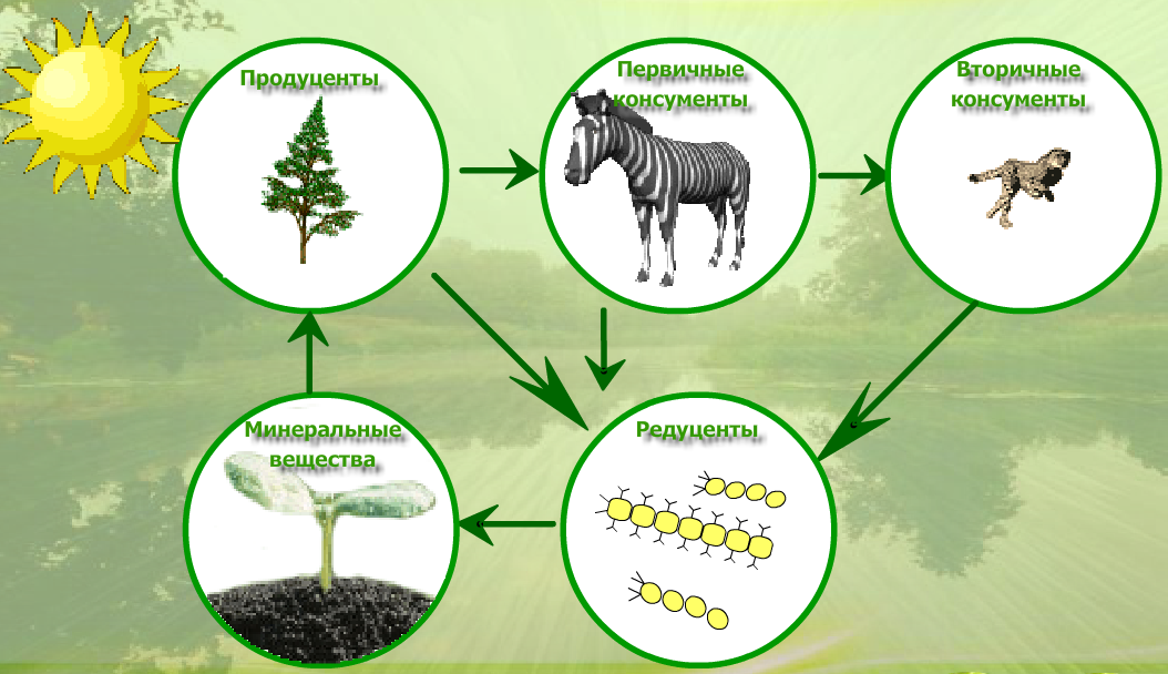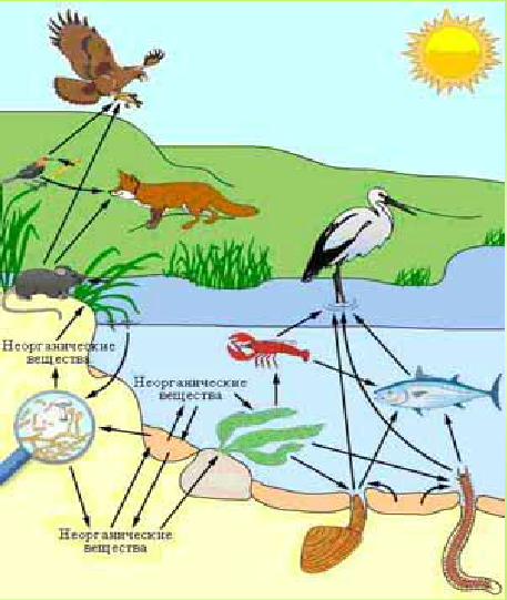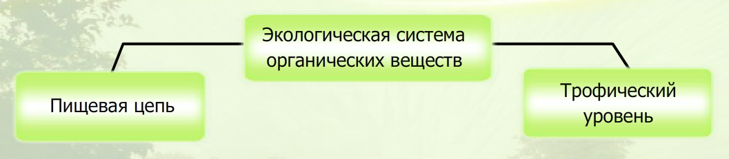 Экологическая система органических веществ. Внутри экологической системы органические вещества создаются автотрофными организмами (например, растениями). Растения поедают животные, которых, в свою очередь, поедают другие животные.