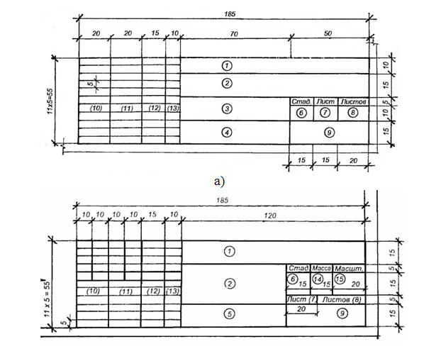 На рисунке 3.1а показана форма, размеры и заполнение граф основной надписи строительных чертежей основного комплекта – чертежи планов, разрезов, фасадов зданий, в том числе схем расположения сборных конструкций в составе проектов/работ обучающихся. Для чертежей строительных изделий применяется основная надпись, изображённая на рисунке 3.1 б.