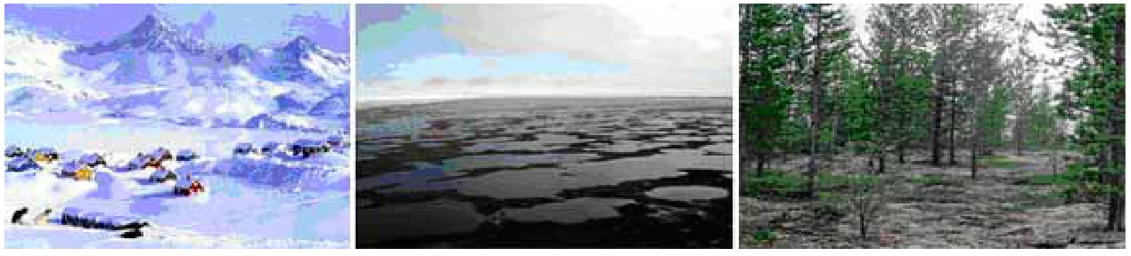 Жердің полярлы аудандары. Солдан оңға қарай: арктикалық шөлейт (Гренландия), тундра (Якутия), ормандытундра (Хибин)