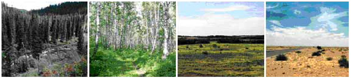 Шектеулі белдеулердегі табиғи аймақтар. Солдан оңға қарай: тайга (Саян), жалпақжапырақты орман (Красноярск), жазық дала (Ставрополь), шөл (Гоб)