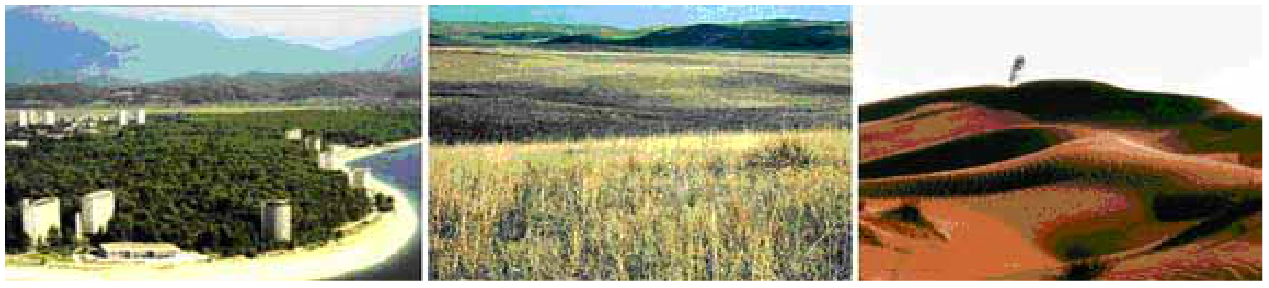 Субтропикалық белдеу. Солдан оңға қарай: мәңгіжасыл орман (Абхазия), (Небраск), шөл (Қарақұм)