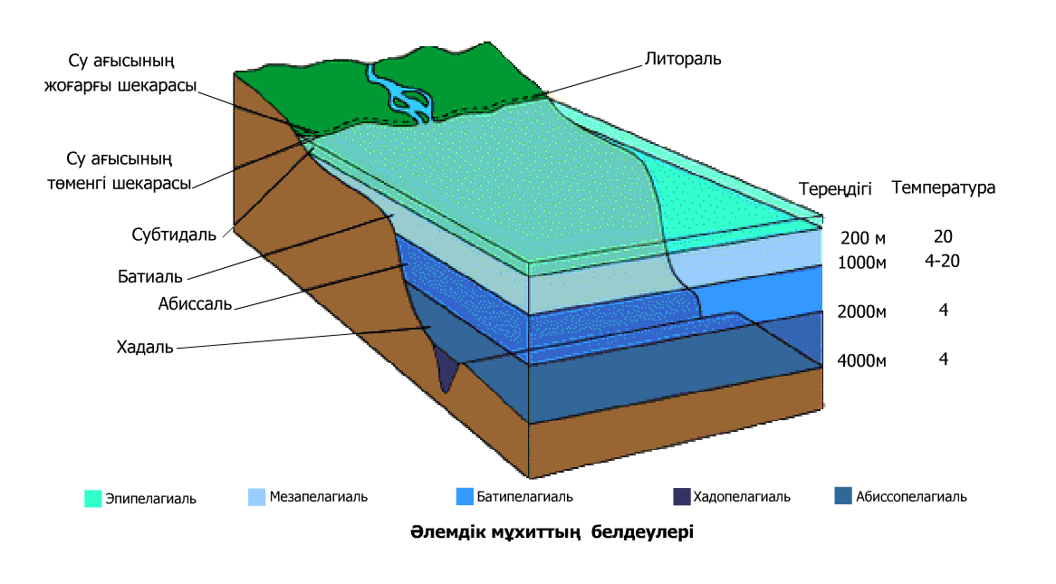 Тірі ағзалар тек құрлықты ғана толтырып қоймайәлемдік мұхиттада өмір сүреді. Мұхитта он мыңдағы өсімдіктер мен жүз мыңдаған жануарлар өмір сүреді. Әлемдік мұхитта өсімдіктер мен жануарлардың екі күшті бір-бірінен айырмашылығы бар пелагиаль (судың беткі қабаты) мен бенталь (мұхиттың түбі) бар.