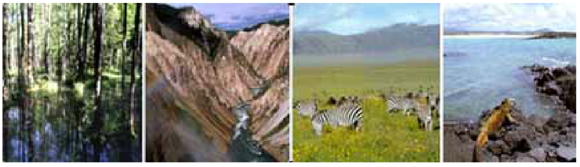 Қорғалатын аймақтар. Солдан оңға қарай: Орман қуысы (Белурусь), Йеллоустон (США), Нгоронгоро (Танзания), Галапагос аралдары (Эквадор)