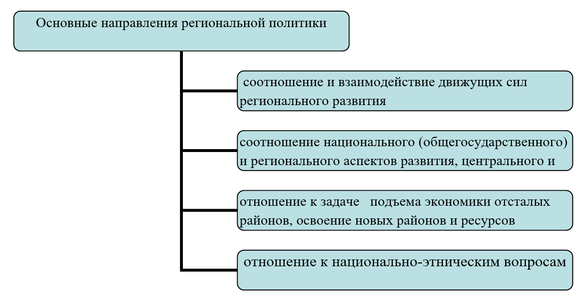 Региональная политика неизбежно пересекается с другими направлениями внутренней политики. Региональная политика определяется не по «отраслевому» содержанию применяемых ею мер, а по целям, связанным с регулированием баланса «центр – регионы». Регулирование же баланса может проводиться самыми разными методами.
