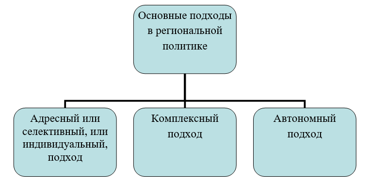 В экономической региональной политике этому подходу соответствуют концепции адресной помощи, полюсов роста, специальных экономических зон, экспериментальных площадок для проведения реформ. Смысл подхода состоит в определении (селекции) территорий, в отношении которых центр принимает адресные (индивидуальные) решения.