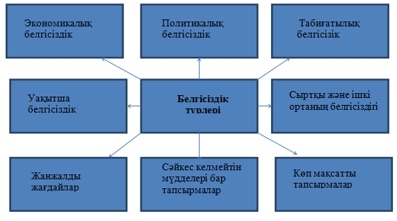 Қайшылық түрлі аспектілерде көрсетіледі және түрлі қызмет арасында тәуекел бір дағынан қоғамдық мәнді нәтижелерге бейнеленгенін, екінші жағынан тәуекел авантюризмға әкелетінін болжайды. Баламалық бір немесе бірнеше шешімдерден біреуін таңдауын білдіреді. Ол қиыншылық дірежесіне байланысты бірнеше әдістермен шешіледі. Жай жағдайларда таңдау өткен жылдың негізінде жүзеге асырылады, ал күрделіде арнайы әдістер мен әдістемелерді қолдану қажет. Тәуекел белгісіздікпен байланысты, яғни ол тәуекелдің көзі болып табылады. Тәукелді басқаруда басты мән осы факторга бөлінеді, өйткені тәжірибеде тәуекелді басқаруды және реттеуді оңтайландыру қажет. Белгісіздік түрлері 1.3-суретте көрсетілген.