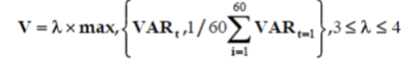 Резервтiк капиталдың өлшемiне талаптары V минимум екі өлшеммен есептелген: орта VAR (VARt) ағымдағы мәні және3 пен 4 аралығындағы коэффициентке алдыңғы 60 күндерге көбейтіндісімен: