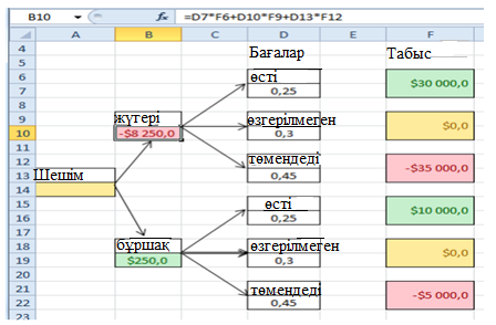 Шешім ағашын құрудың мысалын қарастырыңыз және өзіңізді жасаңыз. Фермер жүгері немесе соя өсіре алады. Бұл дақылдардың болашақ егін бағасының өсуі, бұрынғы деңгейде қалуы немесе төмендеуі ықтималдылығы сәйкесінше 0,25, 0,30 және 0,45 құрайды. Егер баға көтерілсе, жүгері дақылынан таза табыс $ 30,000, соя дақылдарының түсімі $ 10,000 құрайды, егер бағалар өзгеріссіз қалса, фермер шығындарды өтейді. Бірақ егер бағалар төмендесе, жүгері мен соя дақылдарының түсімі сәйкесінше 35,000 және 5000 $ шығынға әкеледі. Шешім ағашын құрыңыз. Фермер қандай дақыл өсіру керек? Оның пайдасының күтілетін мәні қандай?