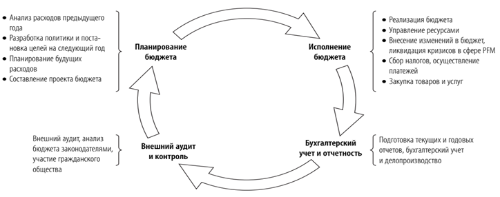 На рисунке 5.1.1 представлена базовая схема бюджетного цикла и ключевые функции, характерные для каждой из четырех его стадий.
