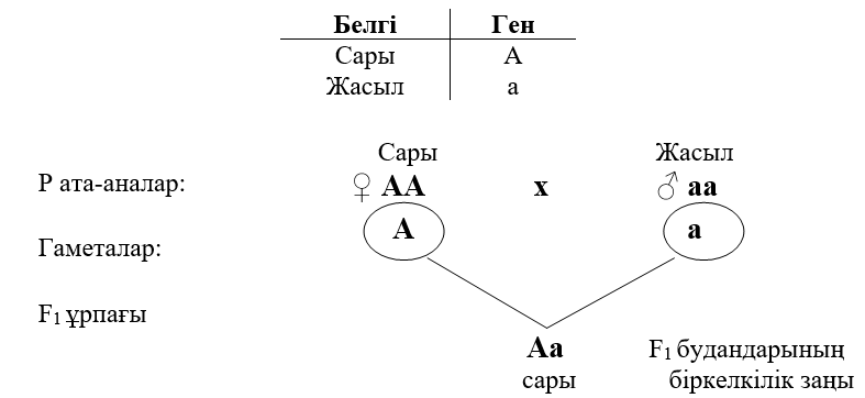 1-сурет – Бұршақ тұқымдарының түсінің тұқым қуалауы, бірінші ұрпақ будандарының біркелкілік заңы