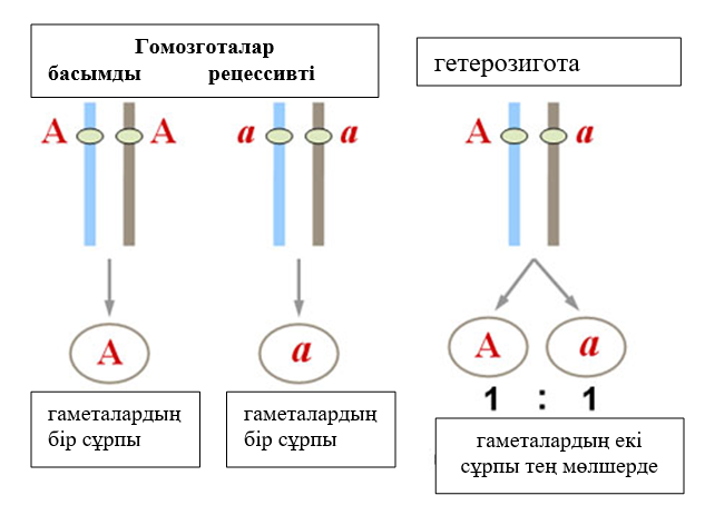 Гаметалардың тазалық заңы: гетерозиготаларда гаметаның пайда болуында аллель гендері араласпайды, бірақ басым және рецессивті аллельмен бірдей гаметалар түзе отырып толық тазалықтағы гаметаларға бөлінеді.