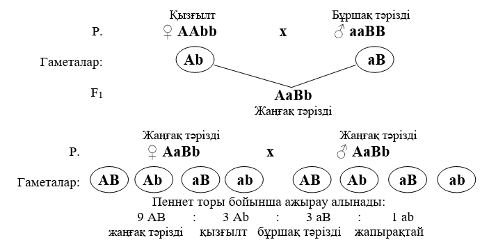 9:6:1 ажырауы. Бұл ажырау ааВВ және ААвв сфералық пішінді екі ата-аналық ағзаларды будандастыру кезінде асқабақтағы ұрық пішінінің (Cucurbita pepo) тұқым қуалауында байқалады. F1 ұрпағында барлық бірінші буын будандары диск тәрізді пішінді болады. ААвв және ааВВ генотиптері F2 ұрпағында фенотиптік тұрғыдан ерекшеленбейтіндіктен, олар 6 санын береді. Диск тәрізді пішін екі басым гендердің (А және В) өзара әрекеттесуі нәтижесінде пайда болады, ал ұрықтың ұзартылған пішіні олардың рецессивті аллельдерінің (aaвв) тіркесуі нәтижесінде пайда болады.