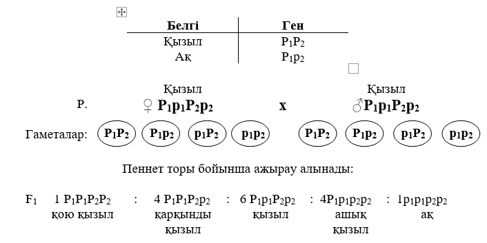 Егер белгі басымды гендердің санына байланысты өзгермесе, ажырау 15:1 қатынасында болады (қызыл : ақ).