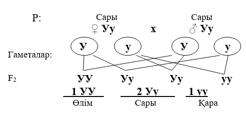 Тышқандарда жүннің басым сары пигментациясының У гені гомозиготалы күйде өлімге әкеледі және тышқандардың эмбриондық өліміне әкеледі, ал оның у аллелі қара пигментацияны тудырады және өміршеңдікке себепші болады (17-сурет).