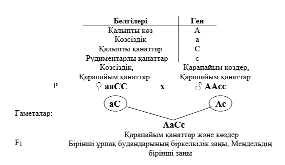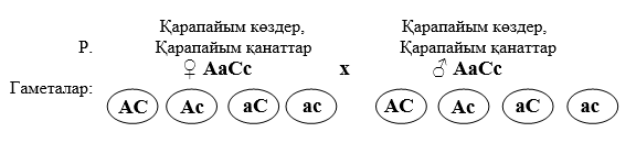 1 есеп. Дрозофила шыбынында қарапайым қанаттар рудиментарлы қанаттардан басым (доминат), көздің қалыпты дамуы көзсіздіктен басым болады. Бұл тапсырмада біз 2 белгіні қарастырамыз: қанаттардың пішіні және көздің дамуы. Екі белгі де әртүрлі хромосомаларда болады, сондықтан олар бір-біріне тәуелсіз тұқым қуалау болады.