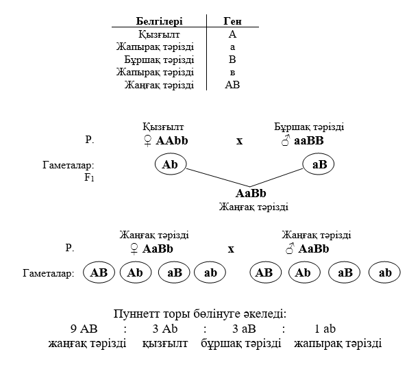 1 есеп. Тауықтарда қырқаның қызғылт формасы а доминантты генімен анықталады, бұршақ тәрізді қырқаның пішіні доминантты В генімен. А және В гендерінің үйлесімі жаңғақ тәрізді қырқаны дамытады. Рецессивті гендер жапырақ тәрізді қырқаны негіздейді. Гомозиготалы жекелер қызғылт түсті қырқаны бұршақ тәрізді қырқамен будандастырады. I және II гибридті ұрпақтарда қандай фенотип болады?