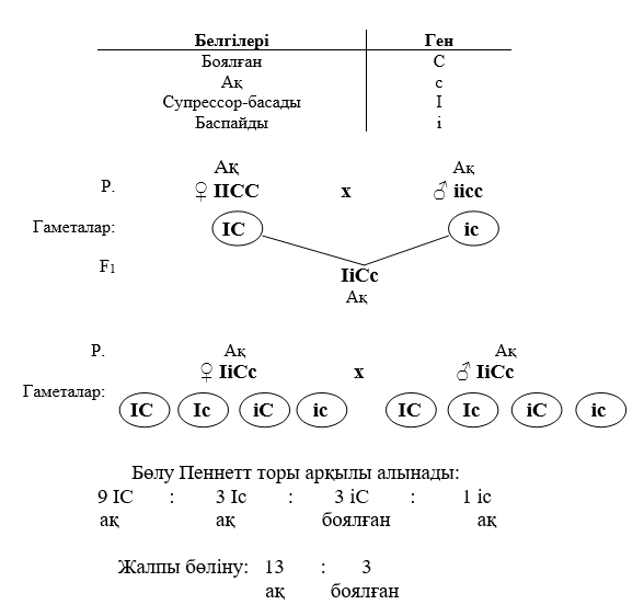 2 есеп. Тауықтардың көптеген тұқымдарында (плимутрок, виадонт) доминатты С гені боялған қауырсынды анықтайды, ал оның с аллелі – ақ. Леггорн тұқымында эпистатикалық доминантты I ген бар, пигменттің дамуын тежейді, тіпті С генінің қатысуымен. Оның i -аллелі С геніне өз әрекетін жасауға мүмкіндік береді. Ақ Леггорн (IIСС) ақ виадонтпен(iicc) будандастырды. Гибридтердің I және II ұрпақтарындағы боялған қауырсыны бойынша бөлінуін анықтаңыз.