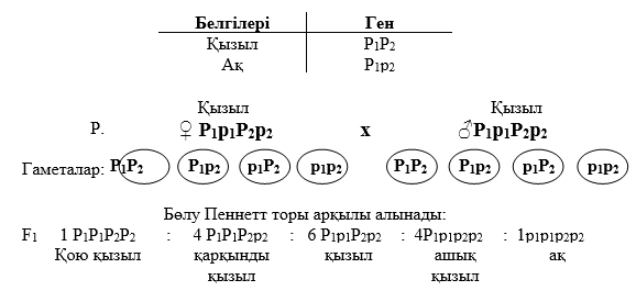 Қызыл дәнді өсімдіктер бір-бірімен будандастырғанда, ұрпақтарда 15 түрлі түсті бөліну пайда болды, 1 ақ. Түстің қарқындылығы әр түрлі болды. Будандасқан өсімдіктердің генотипін және ұрпақтың болялған дәндерінің түсінің өзгеруін анықтаңыз.