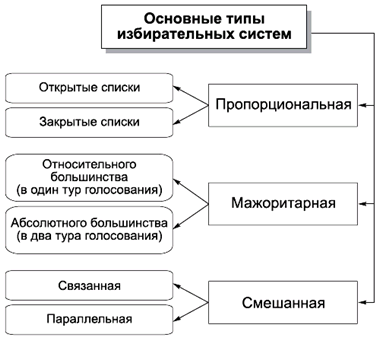 Существуют разновидности избирательных систем – мажоритарная, пропорциональная и смешанная.