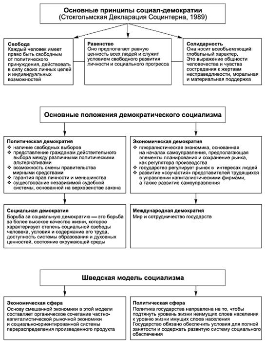 Социал-демократические первоначально были партиями рабочего класса, а сейчас включают все трудящиеся слои – рабочих, служащих, интеллигенцию, мелких бизнесменов. Наиболее крупные социал-демократические партии: Социал-демократическая партия Германии, Социалистическая партия Франции, Лейбористская партия Англии, Социал-демократическая партия Италии, Шведская социал-демократическая партия, Финляндская социал-демократическая партия. Социал-демократы неоднократно побеждали на выборах и находились или сейчас находятся у власти в Германии, Швеции, Норвегии, Финляндии и других странах.