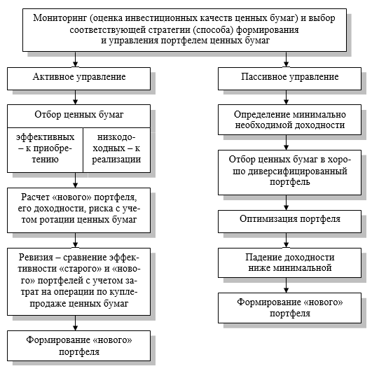 Совокупность применяемых к портфелю методов и технических возможностей представляет способ его формирования и управления, который может быть охарактеризован как «активный» и «пассивный». Соответствующие этим способам виды инвестиционных стратегий носят аналогичные названия. На рисунке 4.2 изображена структурная схема, иллюстрирующая процесс формирования и управления портфелем ценных бумаг при реализации обеих вышеназванных стратегий.
