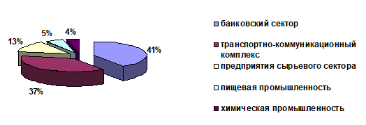 Из приведенной диаграммы видно, что на сегодняшний день наибольшая доля рынка названных финансовых инструментов приходится на облигации банковского сектора. Второе место занимает транспортно-коммуникационный комплекс, третье – предприятия сырьевого сектора, а четвертое и пятое места – соответственно пищевая и химическая промышленность.
