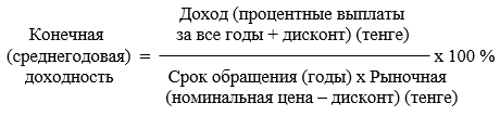 В случае, если эмитент устанавливает наряду с купонной ставкой и скидку с номинальной стоимости при размещении облигаций на срок более года, конечная (среднегодовая) доходность рассчитывается следующим образом: