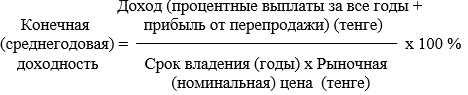 В отличие от дохода, являющегося величиной абсолютной и исчисляющегося в тенге, доходность - относительная величина. Она показывает эффективность вложений инвестора (отношение дохода к затратам) и выражается в процентах. Доходность обычно сводится к годовому исчислению.