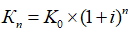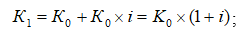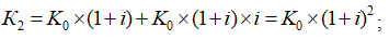 Если происходит вложение денег в банк, то при начальной сумме вклада К0 и ставке банковского процента по депозиту i (выраженной в долях единицы) по окончании 1-го, 2-го, ..., n-го года хранения денег в банке у вкладчика окажется сумма К1, К2, ..., Кn: