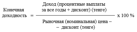 При определении конечной доходности следует учитывать все факторы, формирующие доход (процентные выплаты за все годы, прибыль от перепродажи ценной бумаги; дисконт, установленный при первичном размещении и т.п.).