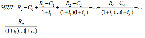 Расчет чистого приведенного дохода (ЧДД) показывает, какова в настоящий момент стоимость средств, ожидаемых в будущем в качестве дохода от реализации данного инвестиционного проекта. При этом, с учетом переменной величины дисконтирующего множителя (процентной ставки безопасного альтернативного вложения денег в банковский депозит), расчетная формула несколько усложняется: