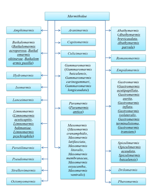 Мермитидтер тұқымдасының нематодтарына сипаттама. Жіңішке жіп тәрізді нематодтар, ұзындығы 10–30 мм және диаметрі 0,2–0,5 мм-ден асады, бүртік тәрізді тангорецепторлары бар басы дөңгелектенген және сүйір конус тәрізді құйрығы бар.
