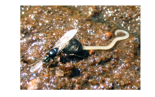 Фотосуреттер сериясынд біз Lasius niger қара бақша құмырсқасының зақымданған жас қанатты аналығынан (құмырсқа нематод шыққаннан кейін қашып кетті, яғни ол біраз уақыт өмір сүрді, нематод түрі шартты түрде фотография бойынша анықталды) паразитті жұмыр нематод құртынығ, яғни мермитидтің (Nematoda: Mermithidae) шығуын байқадық [18].