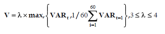 Резервтiк капиталдың өлшемiне талаптары V минимум екі өлшеммен есептелген: орта VAR (VARt) ағымдағы мәні және3 пен 4 аралығындағы коэффициентке алдыңғы 60 күндерге көбейтіндісімен: