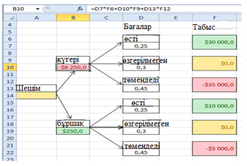 Шешім ағашын құрудың мысалын қарастырыңыз және өзіңізді жасаңыз. Фермер жүгері немесе соя өсіре алады. Бұл дақылдардың болашақ егін бағасының өсуі, бұрынғы деңгейде қалуы немесе төмендеуі ықтималдылығы сәйкесінше 0,25, 0,30 және 0,45 құрайды. Егер баға көтерілсе, жүгері дақылынан таза табыс $ 30,000, соя дақылдарының түсімі $ 10,000 құрайды, егер бағалар өзгеріссіз қалса, фермер шығындарды өтейді. Бірақ егер бағалар төмендесе, жүгері мен соя дақылдарының түсімі сәйкесінше 35,000 және 5000 $ шығынға әкеледі. Шешім ағашын құрыңыз. Фермер қандай дақыл өсіру керек? Оның пайдасының күтілетін мәні қандай?