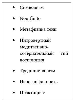 Символизм – основан на представлениях о целостности мироздания, холизме. Природа – главный объект поклонения и восхищения в искусстве конфуцианства – наделена духовно-нравственными характеристиками, символическими смыслами, что и породило ее поэтизацию и эстетизацию.