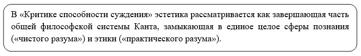 Кант впервые в истории эстетической мысли четко и ясно показал, что сфера эстетического – это совершенно самостоятельная сфера человеческого опыта, человеческого духа, которая венчает собой всю духовно-практическую (познавательную и нравственную) деятельность человека, снимая существующие в ней непримиримые противоречия.