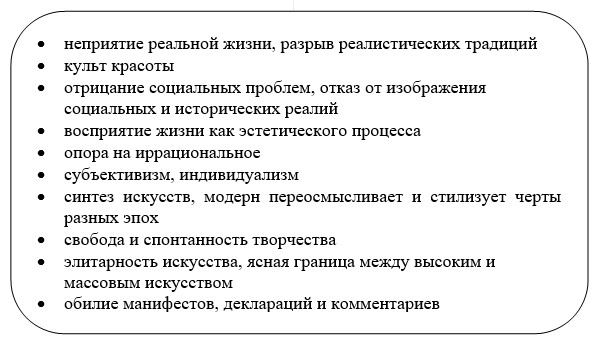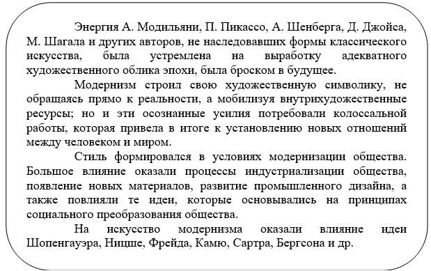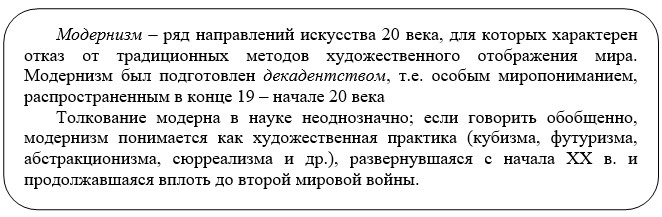 Итак, модернизму, безусловно, был присущ сильный пафос отрицания предшествующего искусства, однако, одновременно он был и своего рода созидательной работой. Произведения Сезанна, Делоне, Кандинского, Мондриана, Дюшана и др. могут рассматриваться как некая проработка современностью собственного смысла. Модернизм, как и предшествующие художественные течения — романтизм, импрессионизм, символизм, — вовлекал в свою орбиту значительный объем негативного содержания мира, не забывая при этом задаваться вопросами о человеческой судьбе; в этом смысле у модернизма была некая проекция в будущее.