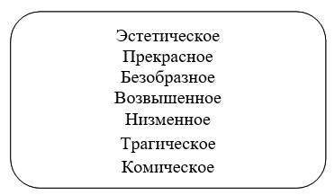 В категории эстетического отражены наиболее общие свойства всех эстетических предметов и явлений, которые, в свою очередь, специфически отражаются в других категориях эстетики