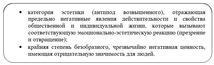Категории эстетики раскрывают не только гармонические, т е. позитивные, эстетические свойства, но и негативные, дисгармонические, отраженные в категориях безобразного, низменного, показывая тем самым противоречия реальной действительности.