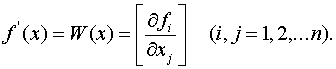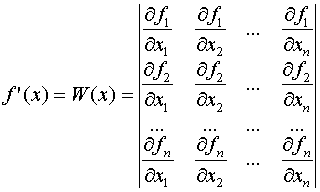 Из анализа формул (5) и (6) следует, что под производной f¢ (x) следует понимать матрицу Якоби системы функций f1 , f2, ..., fn, относительно переменных x1, x2, x3, ..., xn, то есть: