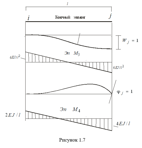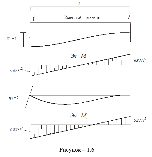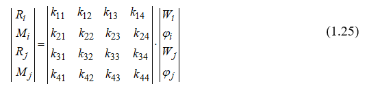 где kαβ – коэффициенты жесткости α,β=1,2,3. Физический смысл коэффициентов kαβ вытекает из соотношения (1.27) как усилие в узле α, возникающее от единичного перемещения по направлению, которое определено индексом β, если все остальные перемещения равны нулю. Выражения вида (1.27) можно аналогично записать для остальных трех компонентов вектора узловых сил КЭ – Mi, Mj, Rj.