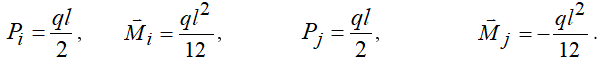 Приведение распределенной нагрузки к узловой выполняется аналогично подобной операции для ферм. Так, для равномерно распределенной нагрузки с интенсивностью q имеем: