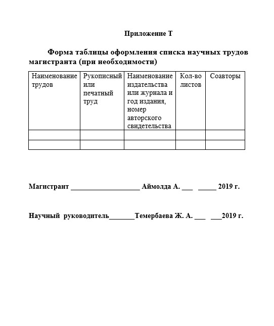 Приложение Т Форма таблицы оформления списка научных трудов магистранта (при необходимости)