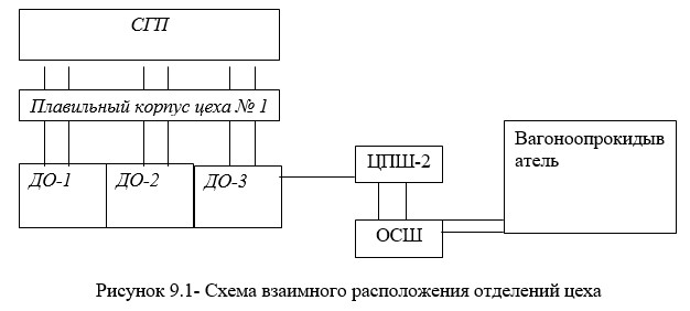 На рисунке 9.1 приведена схема взаимного расположения отделений плавильного цеха № 1 АЗФ. Расположение отделений цеха оставляем в базовом варианте, нет смысла изменять схему шихтоподачи.