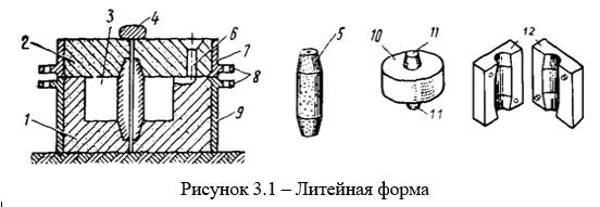 Форма (рисунок 3.1) состоит из двух полуформ 1 и 2, изготовленных из влажной песчано-глинистой смеси, которую уплотняют в металлических рамках 7 и 9, называемых опоками. Полость формы 3, имеющую очертания будущей отливки, получают с помощью модели 10. Чтобы образовать отверстие в отливке, в форму