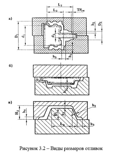 У всех отливок, изготавливаемых различными способами литья, имеются размеры, пересекающие плоскость разъѐма модели и формы и выходящие на плоскость разъѐма (размеры D1, D2, L1, L2, b3, b4 на рисунке 3.2, а, б, в). Точность именно таких размеров отражается в общей надписи на чертежах в соответствии с ГОСТ 26645-85. Присвоим этому виду размеров обозначение ВР2 (В – вид, Р – размер).
