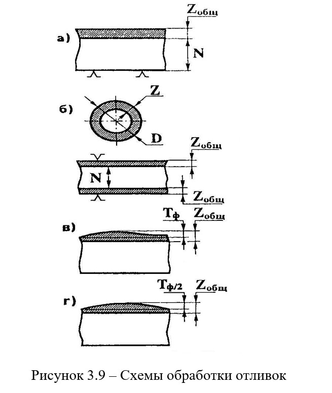 Установите По приложению В общие допуски элементов отливки, учитывающие совместное влияние допуска размера и допуска формы и расположения поверхности. Если таких величин больше двух, то операция расчета выполняется последовательно: сначала для двух величин, затем для общего допуска как результирующего двух величин и третьей величины и т. д. В таблицах 3.13-3.15 знаком «*» обозначены порядковые номера допусков при определении общего допуска по схеме: Т*1>T*2>T*3 и т. д. Введите коррекцию в величины общих допусков с учетом схемы обработки поверхности отливки (рисунок 3.9) при последующем определении припуска на механическую обработку.